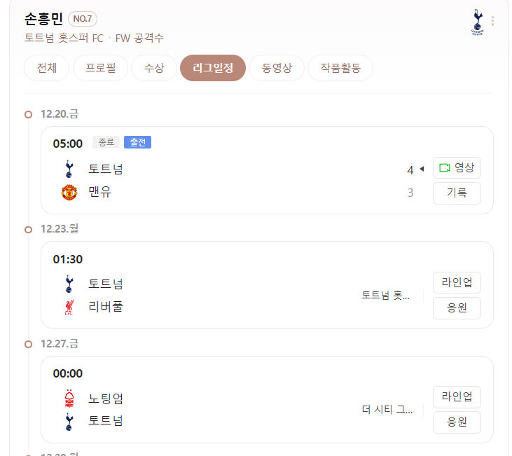 - 주요 선수: 손흥민, 해리 케인, 제임스 매디슨